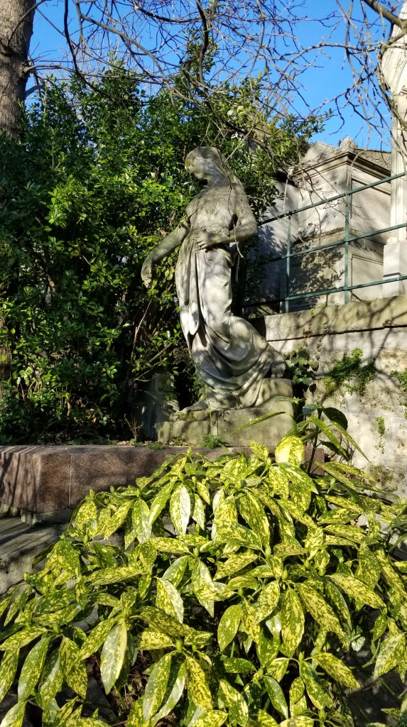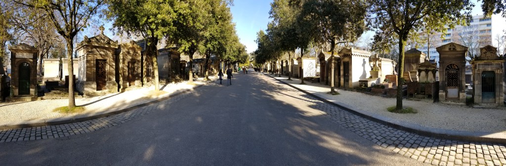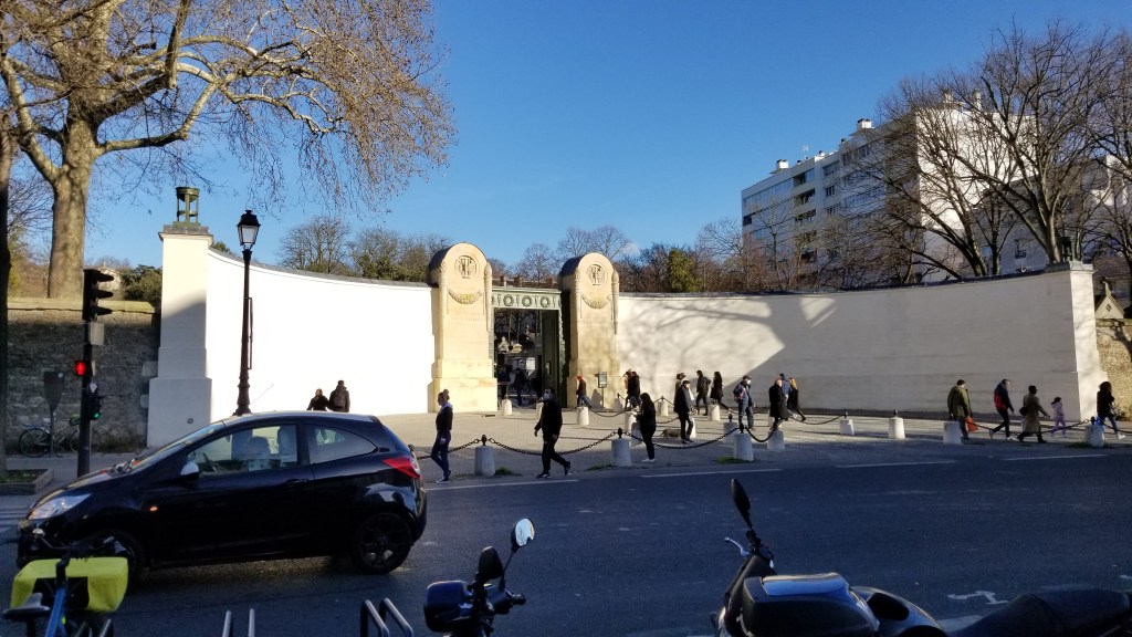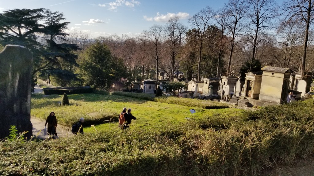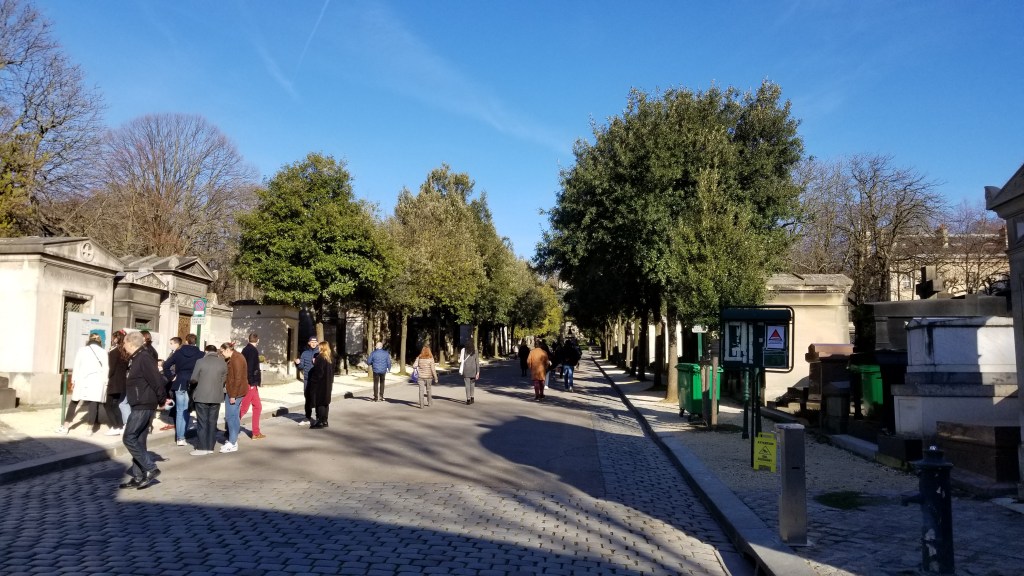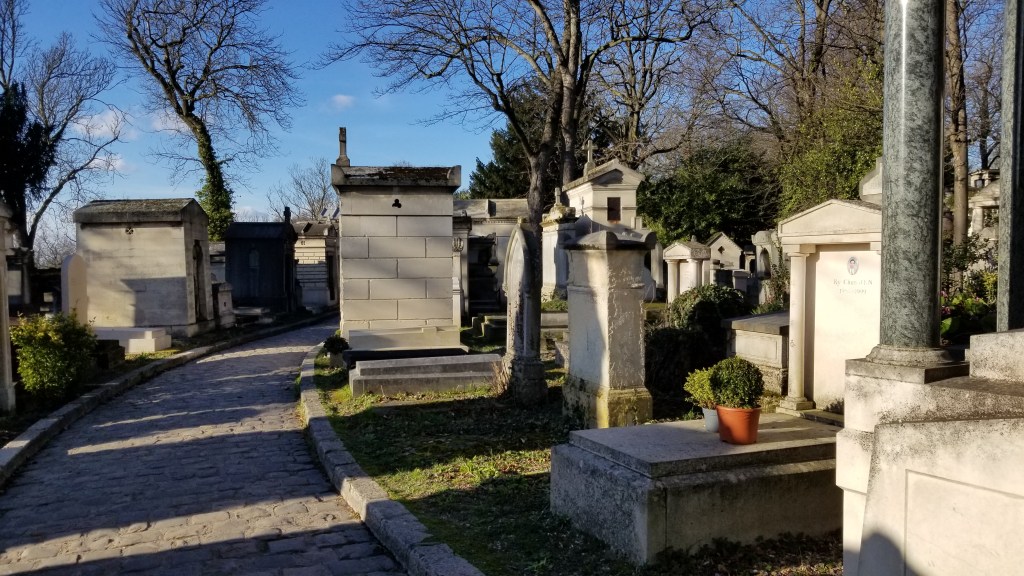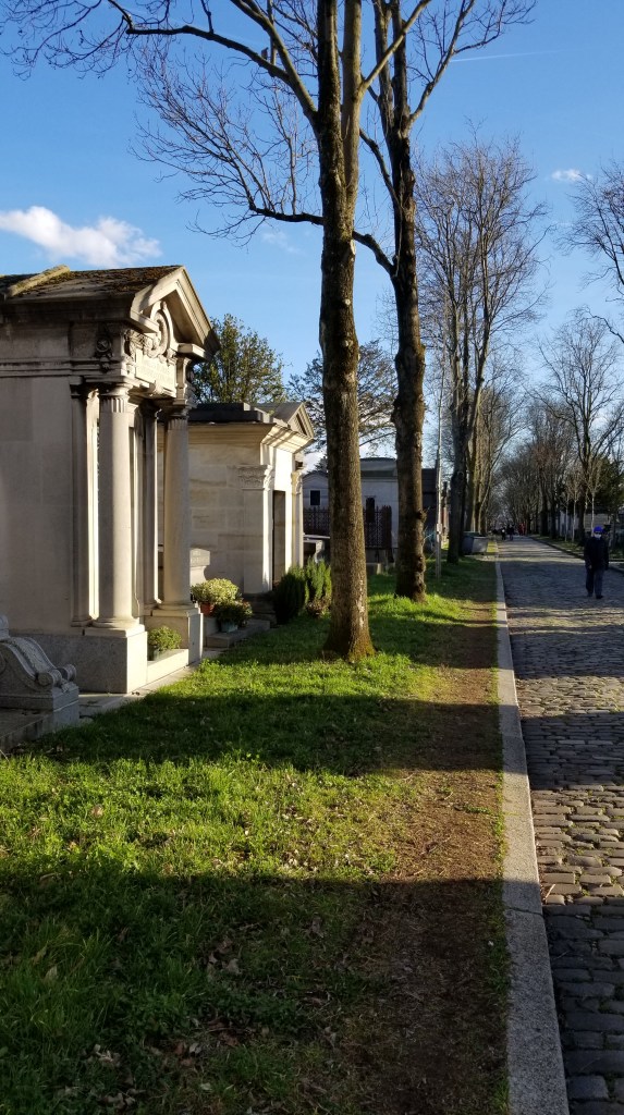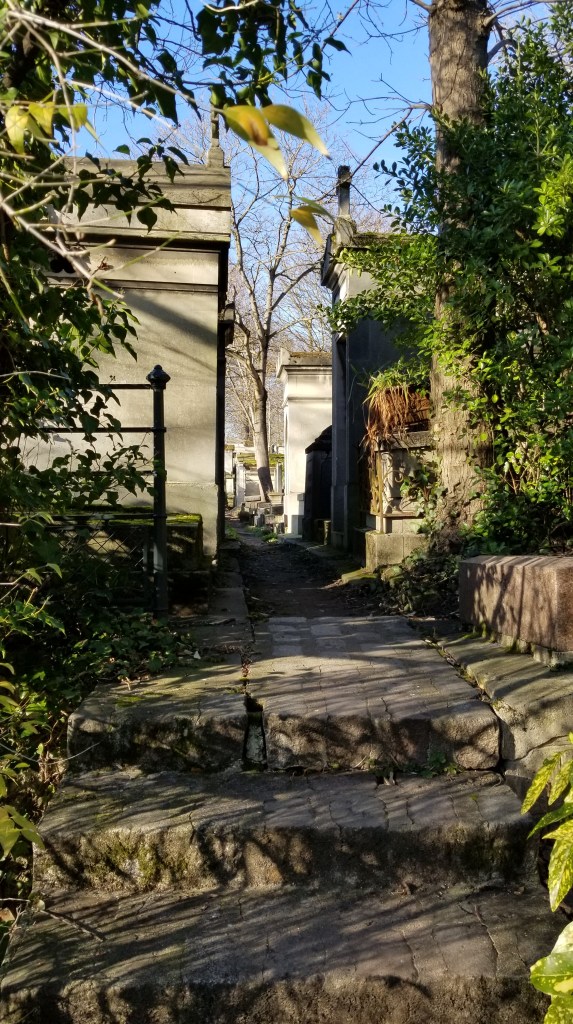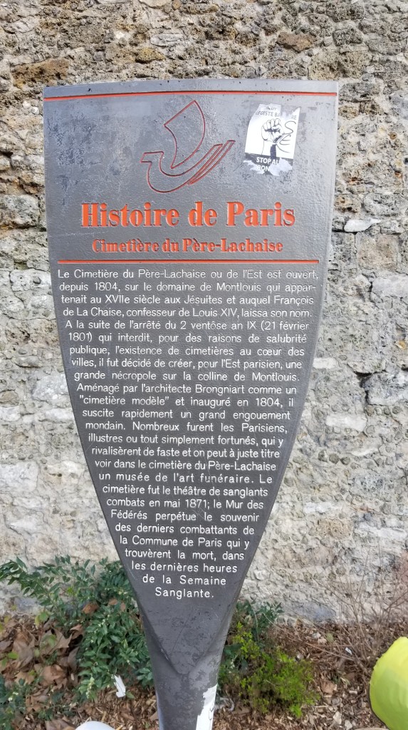 There is a hauntingly beautiful cemetery in Paris called Père Lachaise (https://en.wikipedia.org/wiki/P%C3%A8re_Lachaise_Cemetery), (https://pere-lachaise.com). It covers about 110 acres and is the largest cemetery in Paris. Père Lachaise is located in the 20th arrondissement in the northeast of Paris. Even though it’s quite large, the cemetery is surrounded by city apartment buildings. Walking through the cemetery is quite surreal. I find it quite calm even though filled with graves, sepulchers, and mausoleums. Many of the rich and famous are buried here. At the entrance there is a sign with a list of famous names and where they’re buried in the cemetery.