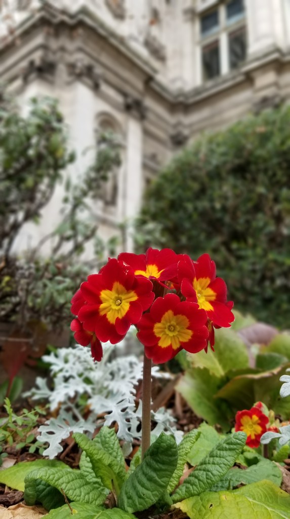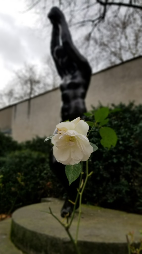 I visited two places to explore the early flora: Jardin des Combattants-de-la-Nueve and Musée Rodin. Jardin des Combattants-de-la-Nueve is located adjacent to the Hôtel de Ville in central Paris (https://fr.wikipedia.org/wiki/Jardin_des_Combattants-de-la-Nueve). The garden is filled with trees and flowering plants. There are cages for rabbits and chickens for during the warmer months. The garden is tucked away behind a gate that wasn’t obvious to me. That is the thing with Paris. You need to turn left instead of right; maybe go straight instead of turn; and almost always if you see an open gate, go through it. That was the case with this garden. I have passed the Hotel de Ville many times and had not seen the garden. But an open gate beckoned and as Robert Frost said, “that made all the difference.” In this garden I found many early spring flowers. The pictures below do not do them justice but give you a glimpse into the beautiful colors of yellow, cream, blue, red, and purple.