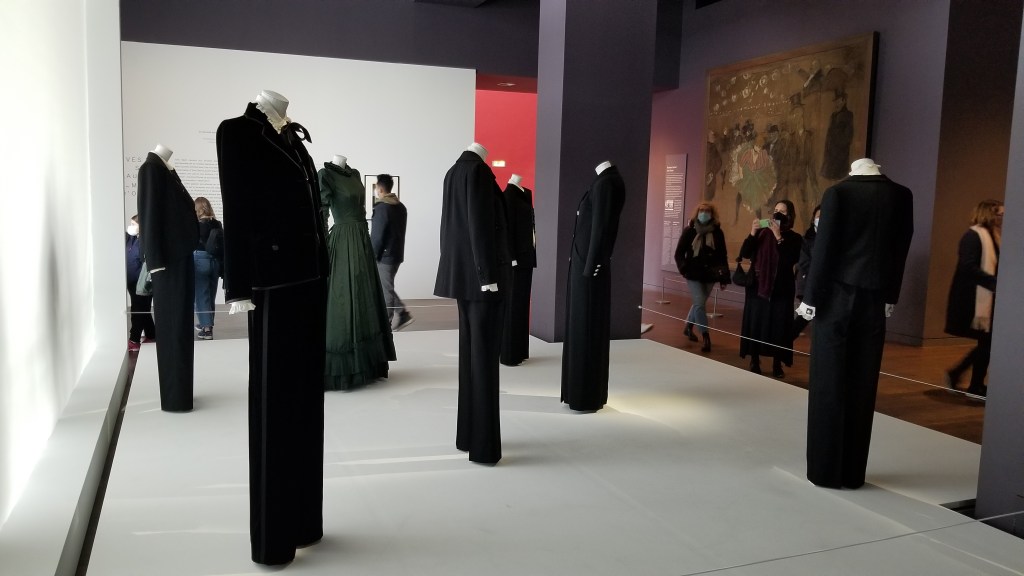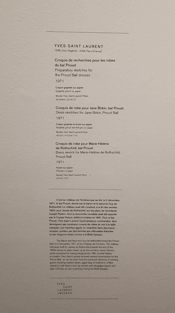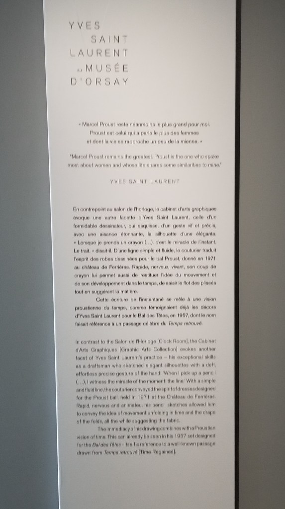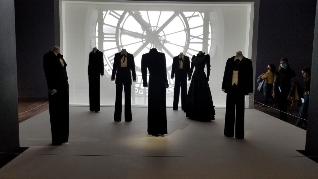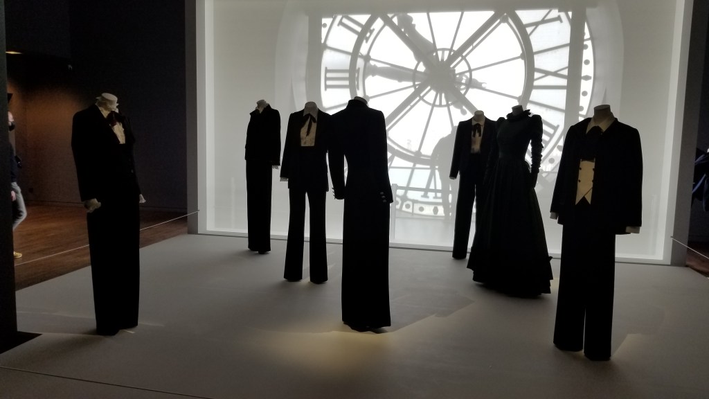 YSL was a prolific clothes designer throughout the 20th century with a large influence on international fashion (https://en.wikipedia.org/wiki/Yves_Saint_Laurent_(designer)). At the Musée D’Orsay, they displayed a number of his formal dresses and suits in front of the famous clock.