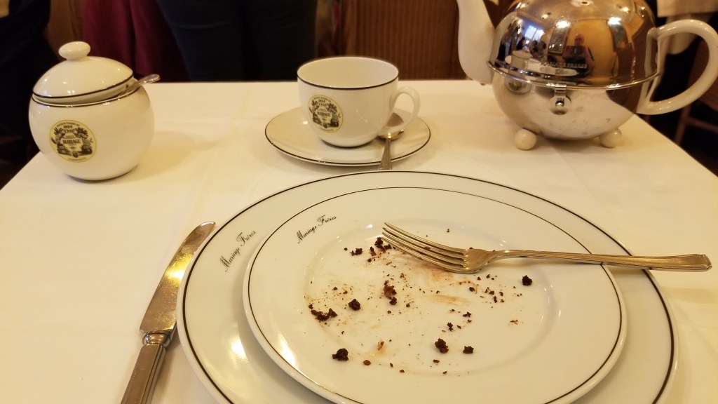 Tea in Paris: One of the joys in Paris is to go to a Tea Salon. My favorite is Mariage Frères (http://www.mariagefreres.com/). They serve hundred of teas with cakes, sandwiches, and just about anything else that goes well with tea. Below is an empty tea pot, tea cup, and plate. This is always the case when I go there. The tea is lovely and the desserts are delicious. When in Paris, I highly recommend taking tea one afternoon (or two or three) at Mariage Frères.